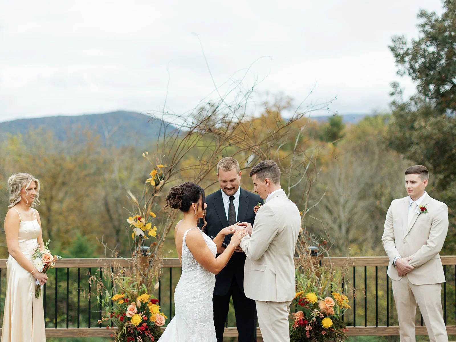 As the couple stood beneath the arch, surrounded by friends, family, and sweeping mountain views, the emotion in the air was undeniable. The soft autumn light, the quiet rustle of leaves, and the warmth of their loved ones created a ceremony that felt both peaceful and powerful.