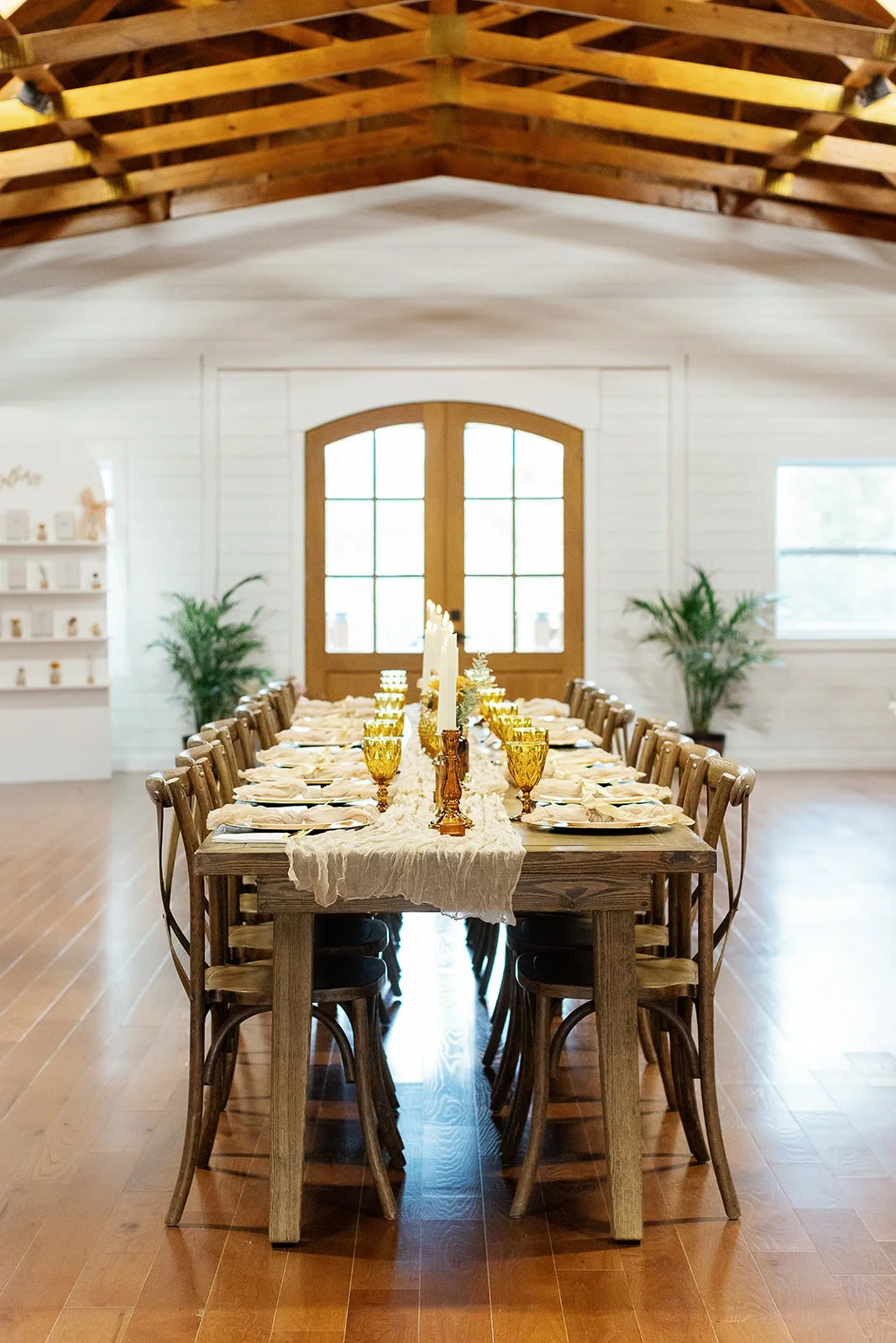 Inside, the reception space felt cozy, elegant, and inviting. Long wooden tables were styled with soft linens, glowing candles, and rich amber glassware that reflected the warmth of the season.