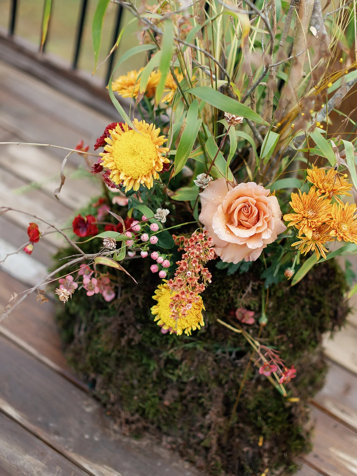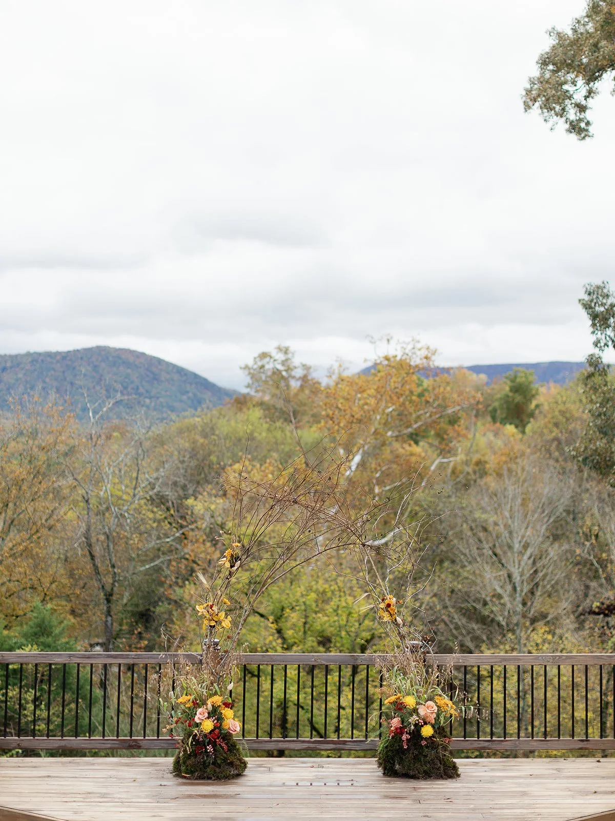 One of the most special elements of the day was the ceremony arch, lovingly handcrafted by family friends of the bride and groom. Made from natural twigs and branches, it perfectly complemented the mountain setting and fall florals. At the base, arrangements of warm-toned blooms and greenery grounded the design with texture and color.